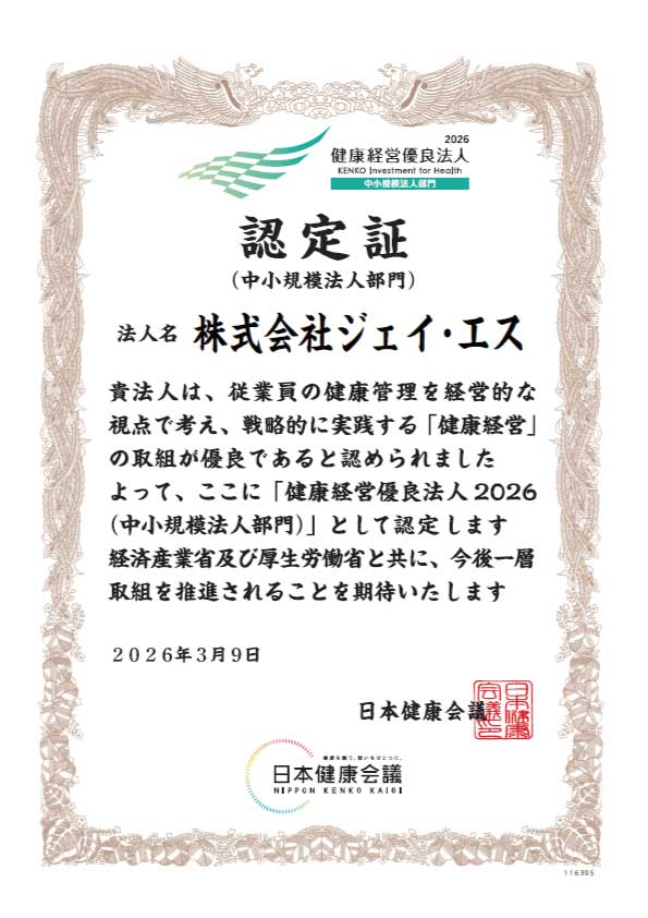 大阪のシール印刷会社「株式会社ジェイ・エス」は、4年連続健康経営優良法人2026(中小規模法人部門)に認定されました。